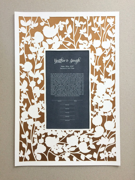 Papercut Ketubah in three layers - Papercut, art print and Metallic gold layer - BELOVED GARDEN design