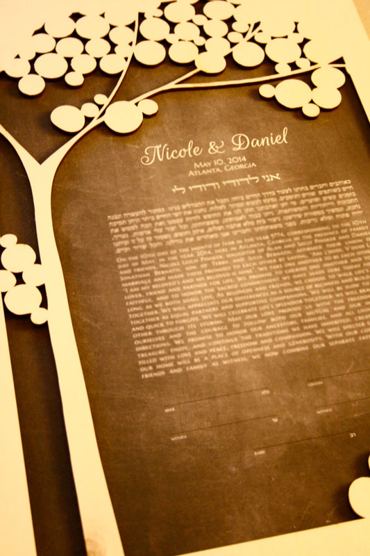 Woodcut Ketubah Branches with Love Birds, Modern abstract minimalist Ketubah Print on Chalkboard paper background