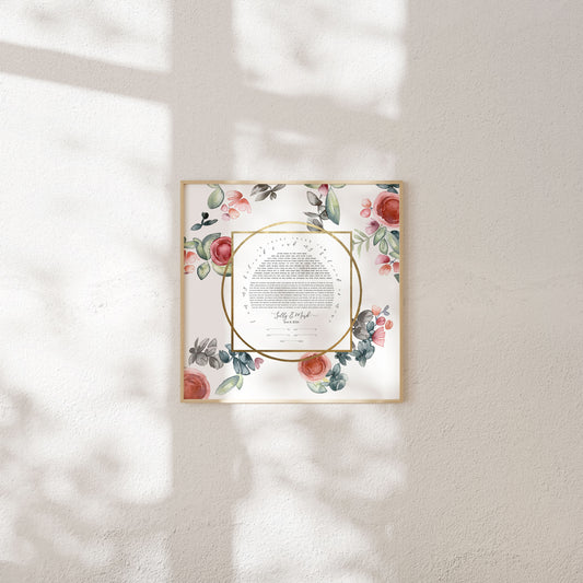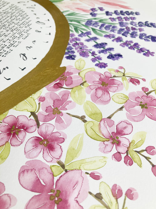 Couple's custom flower selection Nurture and Protect wreath ⤿ Watercolor Gold Ring original Ketubah