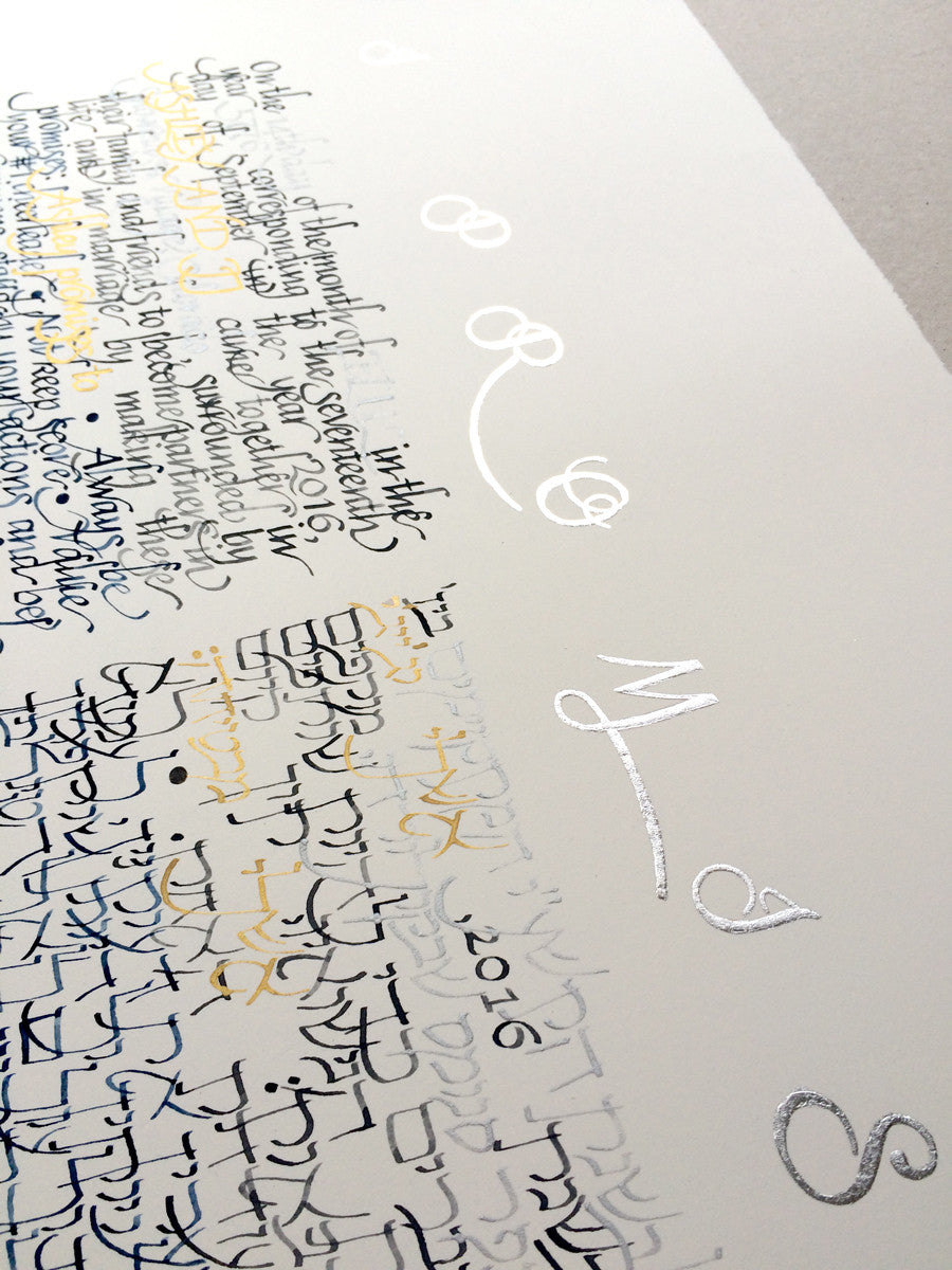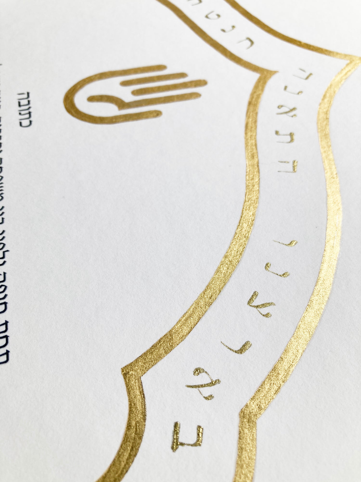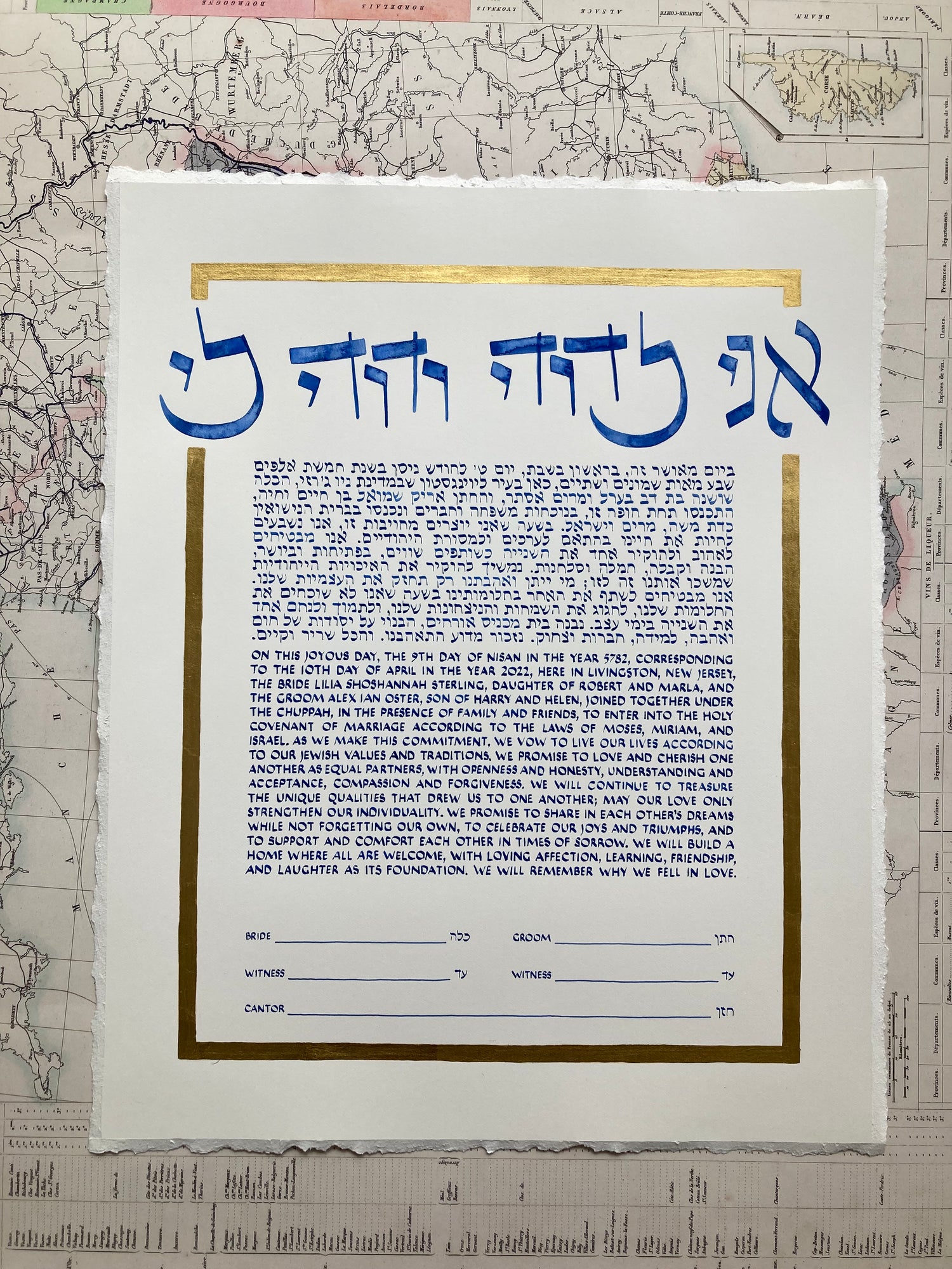 Custom Gold Rim Illuminated Ketubah with gilded Hamsa and gold ink Psalm