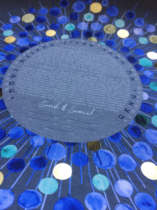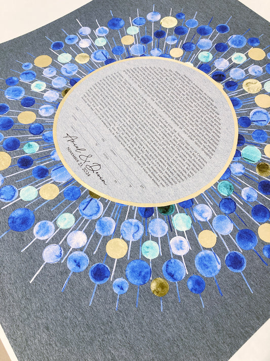 Golden orbs and Gold circle Blue Bliss Ray > Mid century modern Ketubah