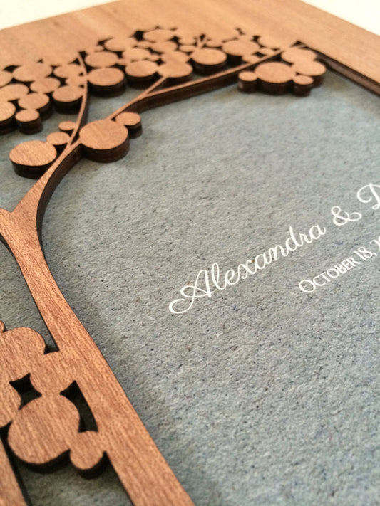 Custom Woodcut Wedding Guest Book Album Branches with Love Birds, Modern abstract minimalist anniversary guestbook with woodcut covers