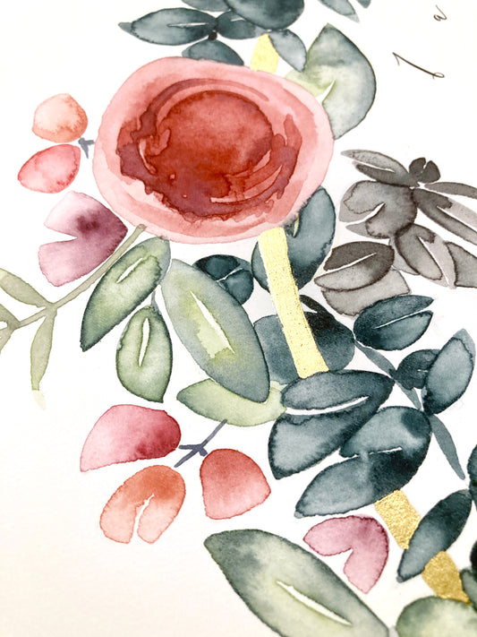 Couple's custom flower selection Nurture and Protect wreath ⤿ Watercolor Gold Ring original Ketubah