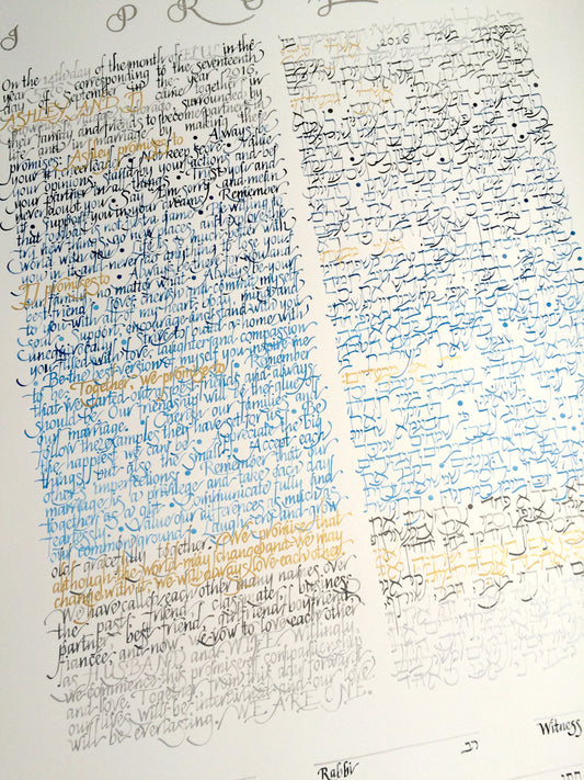 CALLIGRAPHY WATERCOLOUR KETUBAH painting with silver and gold leaf accents