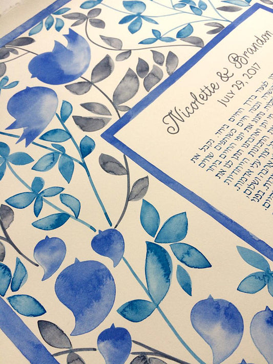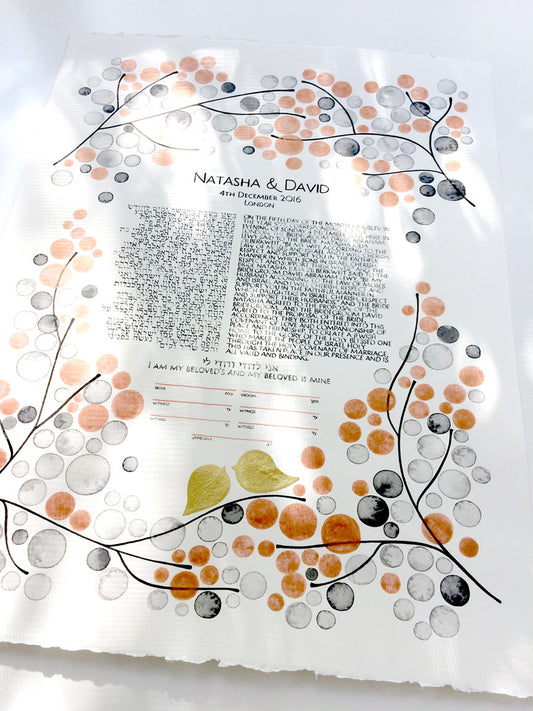 Our Original Art Commission Ketubah is the highest, most valuable and custom art piece we can make for you. Embellished with real Gold or Silver, luscious rich materials, these are entirely custom and handmade, from the concept design to the lettering, painting and crafting, just for you. They range in price depending on the size and materials involved, the complexity of design, the timeframe and degree of crafting techniques. If you fancy one, please get in touch to discuss the details.