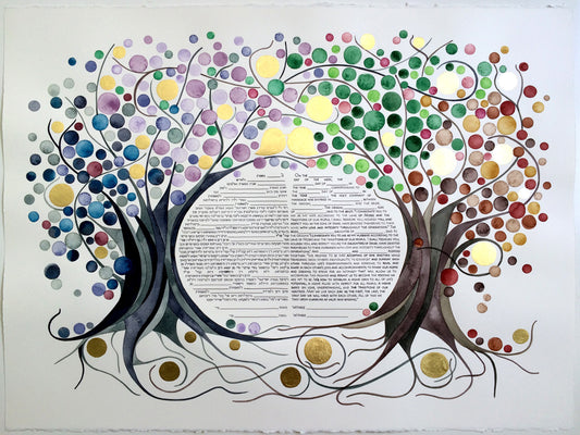 FOUR SEASONS Custom KETUBAH Commission Painting - Entangled Trees with Gold Leaf