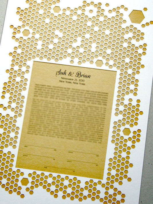 Papercut Ketubah Honeycombs, Modern abstract minimalist Ketubah Print with vintage book background