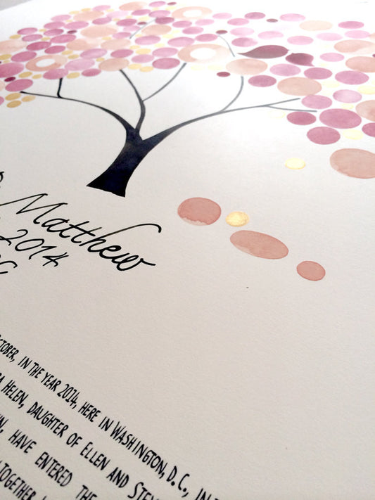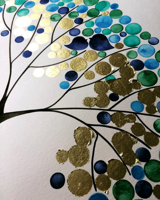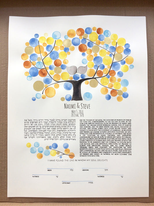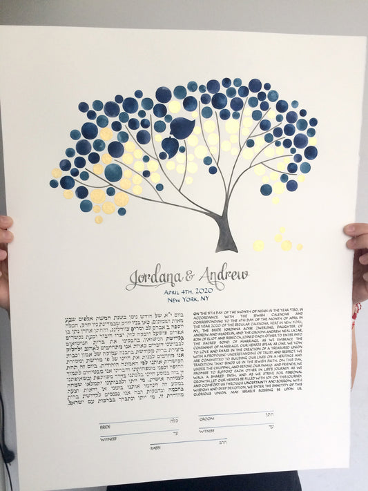 Watercolor Modern Ketubah - GOLDEN LEAF TREE - Happy Tree of Life Under the Chuppah, Custom painted Ketubah made with gold paint