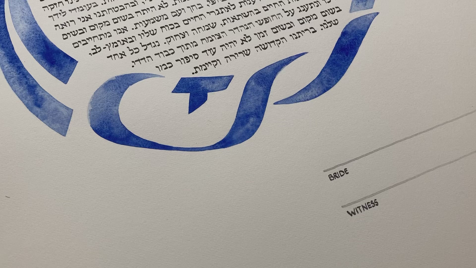 We start the process with a chat about your desired Ketubah, taking in consideration style and colors, design elements, size and shape, gilding, text, translation, time and budget. Make sure you ask about and understand our limited accommodation capacity for the custom painted Ketubah.