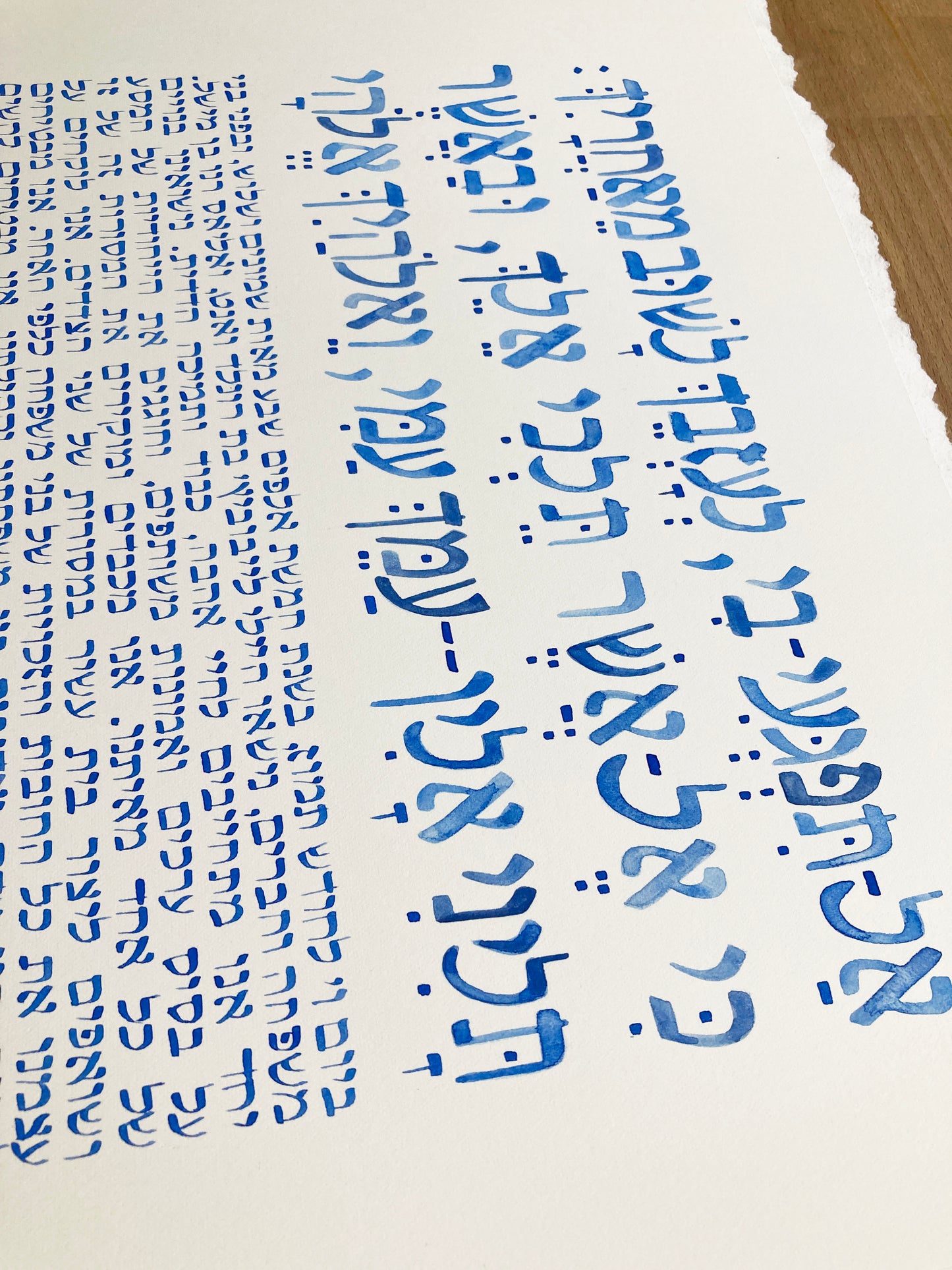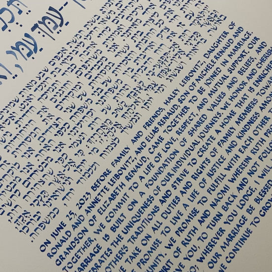We start the process with a chat about your desired Ketubah, taking in consideration style and colors, design elements, size and shape, gilding, text, translation, time and budget. Make sure you ask about and understand our limited accommodation capacity for the custom painted Ketubah.